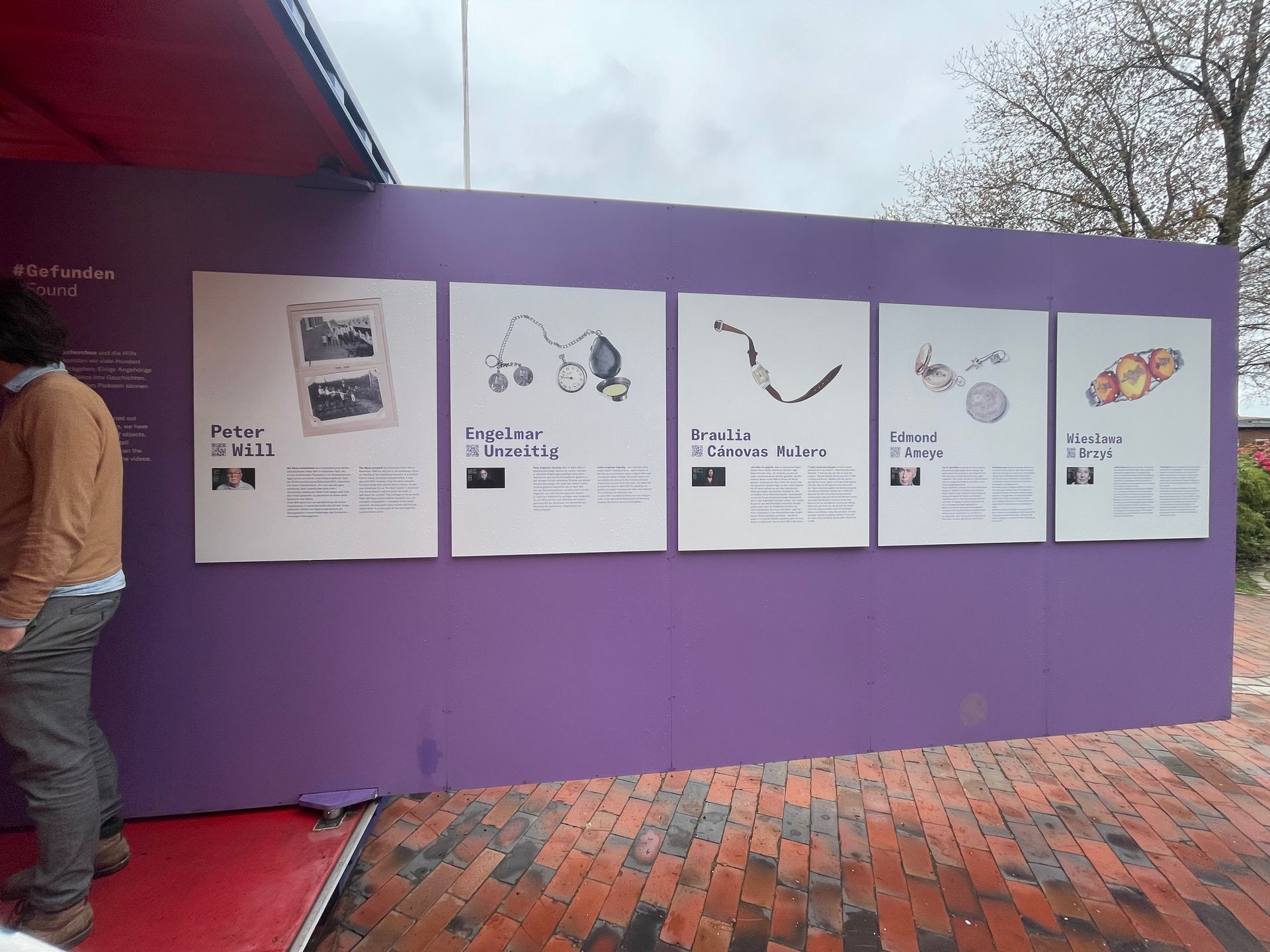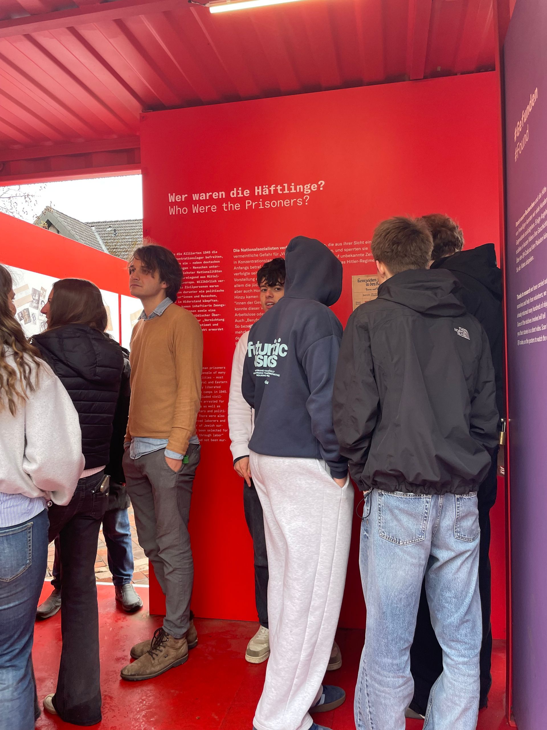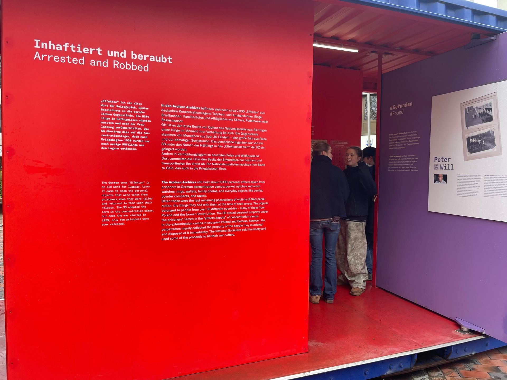 Im Inneren erwartete die Schülerinnen und Schüler eine eindrucksvolle Präsentation: Auf leuchtend roten und violetten Wänden wurden persönliche Gegenstände von KZ-Häftlingen gezeigt – darunter Uhren, Schmuckstücke und Fotografien. Diese Objekte wurden den Menschen während der Zeit des Nationalsozialismus abgenommen und erzählen heute ihre individuellen Geschichten.