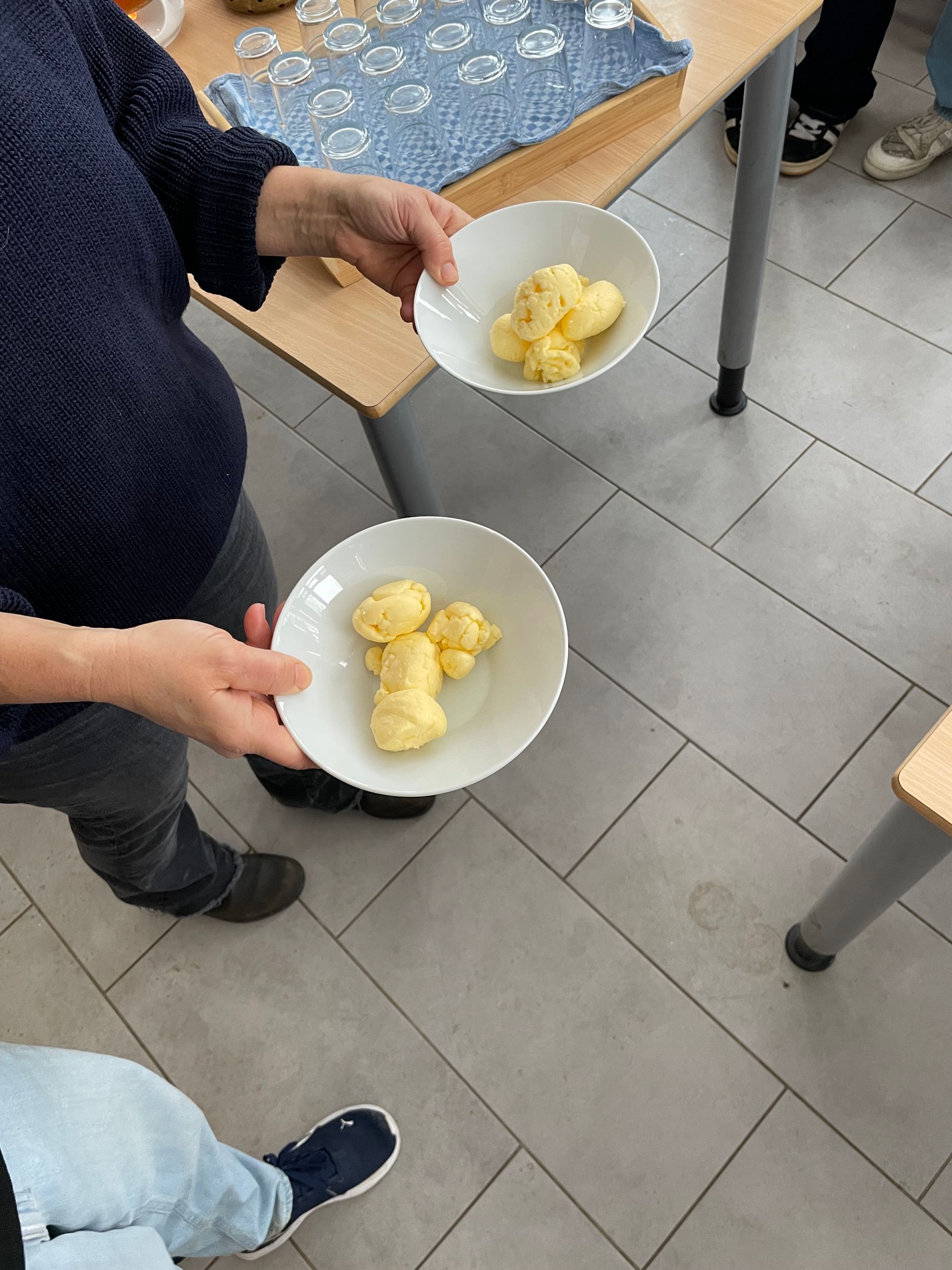 Ein besonderes Highlight war der praktische Teil: Die 10b durfte selbst aktiv werden und Butter herstellen. Dabei konnten alle hautnah erleben, wie aus frischer Sahne durch kräftiges Schütteln echte Butter entsteht – ein Erlebnis, das nicht nur lehrreich, sondern auch sehr unterhaltsam war und natürlich mit frisch gebackenen Brötchen auch geschmeckt hat.