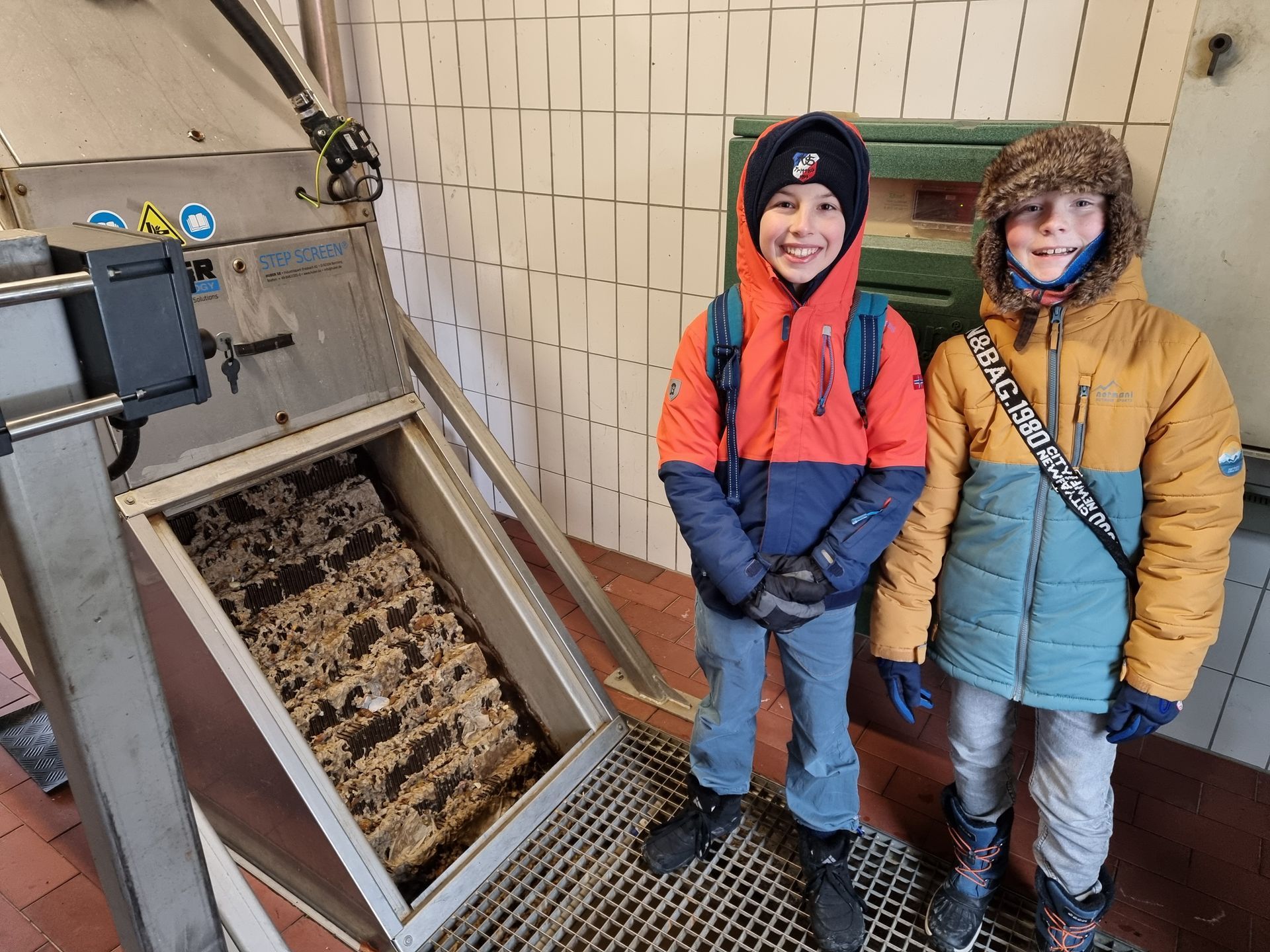 Bei der Führung konnten wir Schritt für Schritt sehen, wie Abwasser gereinigt wird. Als Erstes wurde im Rechenzentrum der Rechen geöffnet. Dort bleiben grobe Dinge hängen, die nicht ins weitere System gehören. Danach ging es zum Sandfang: Durch Belüftung sinken Sand und Schlick nach unten. Das ist wichtig, weil Sand sonst Maschinen beschädigen würde. Anschließend sahen wir ein Becken, in dem ölige Reste an der Oberfläche gesammelt und entfernt werden.