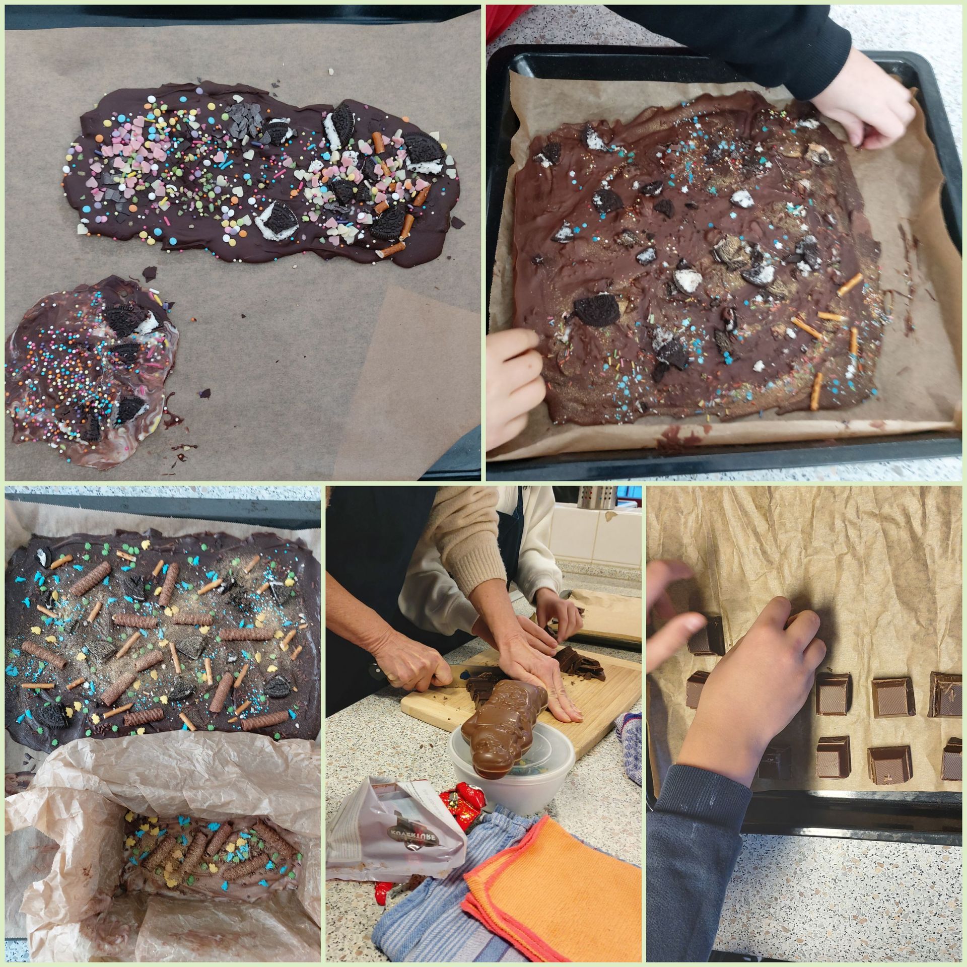 Im Rahmen der VHW des Jahrgangs 5 spielte das Thema „Müll“ eine besonders große Rolle. Auch die Klasse 5d setzte sich kreativ mit diesem wichtigen Thema auseinander und nahm an einem Workshop von Frau Studt in der Lehrküche teil. Dort wurde es richtig spannend: Aus alten Schokoladentafeln stellten die Schülerinnen und Schüler ihre eigene neue Schokolade her. Mit viel Spaß und Kreativität entstanden dabei ganz unterschiedliche Schokoladenkreationen. Der Workshop zeigte den Kindern auf anschauliche Weise, was Upcycling bedeutet – nämlich aus Dingen, die man eigentlich wegwerfen würde, etwas Neues und Leckeres zu machen. So lernten die Kinder, dass Müll nicht immer Müll sein muss und Nachhaltigkeit sogar richtig Spaß machen kann.